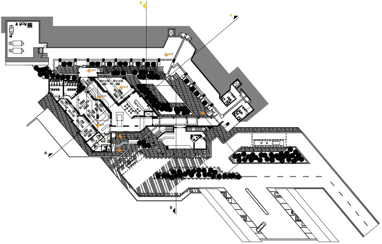 Hotel Design plan AutoCAD drawing that shows work plan drawing details of hotel building along with furniture layout details in building and compound wall design details.