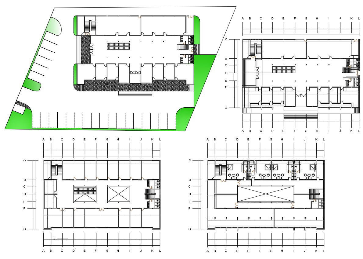 CAD drawing plan of shopping mall building that shows work floor plan drawing details of building along with di9mension parking space and boundary wall details.