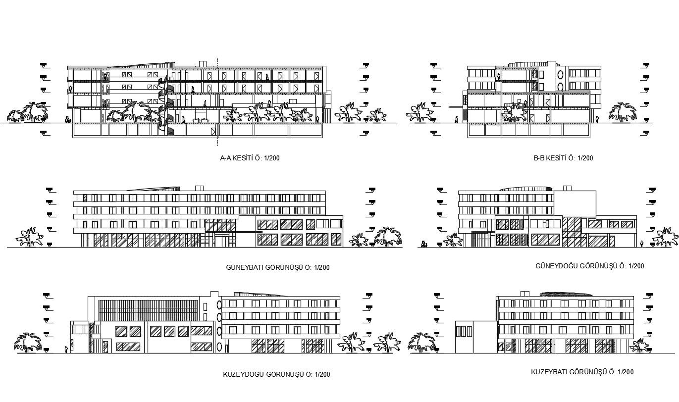 CAD drawing of the multi-story hotel building that shows hotel building different sides of levation drawing along with a sectional drawing of the hotel building.