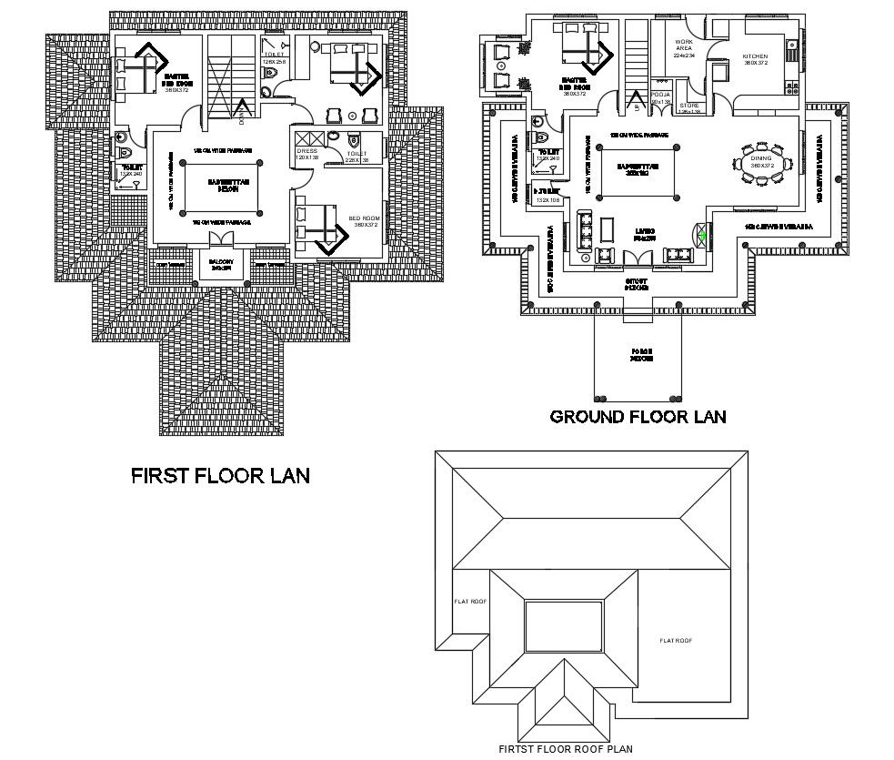 CAD plan of furnished house that shows the floor plan of the two-story house along with furniture details within the rooms and Roof plan details also presented in CAD drawing.