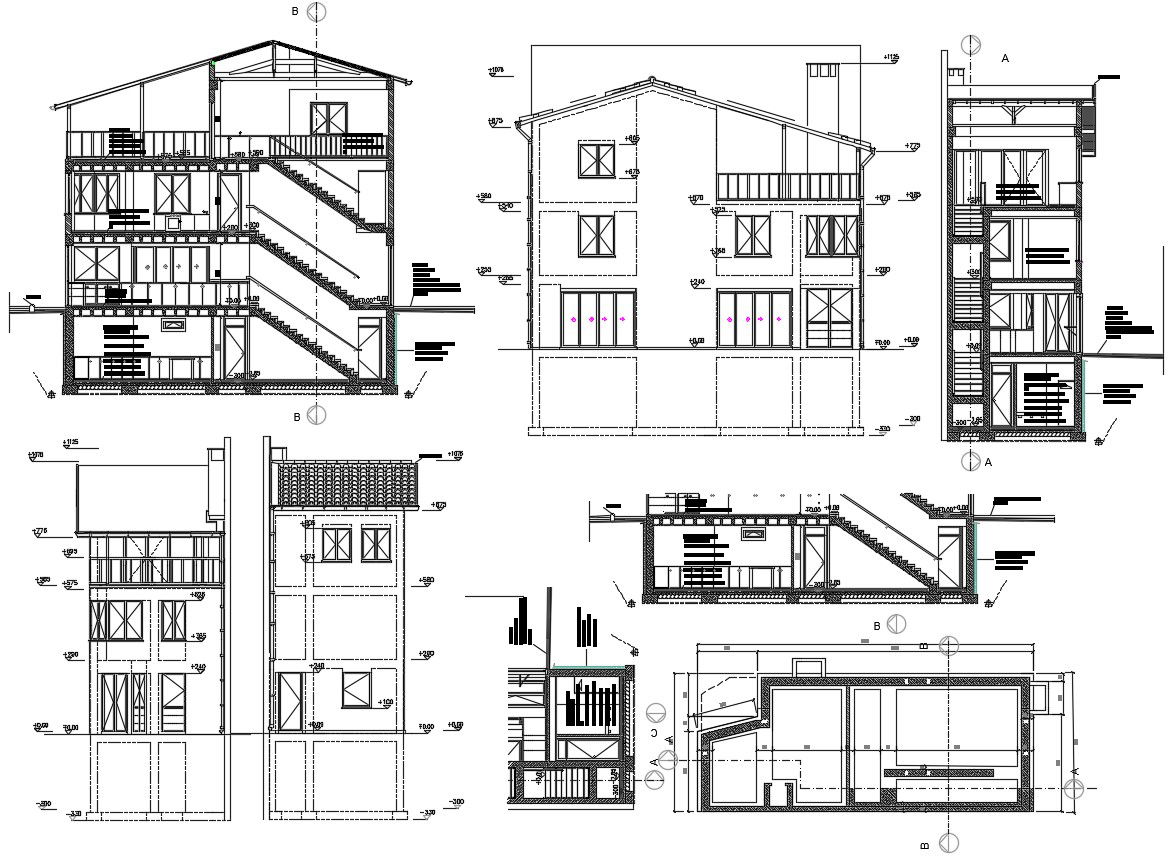 Building elevation and sectional CAD plan details in AutoCAD drawing which shows building design details along with staircase and floor leveling details.