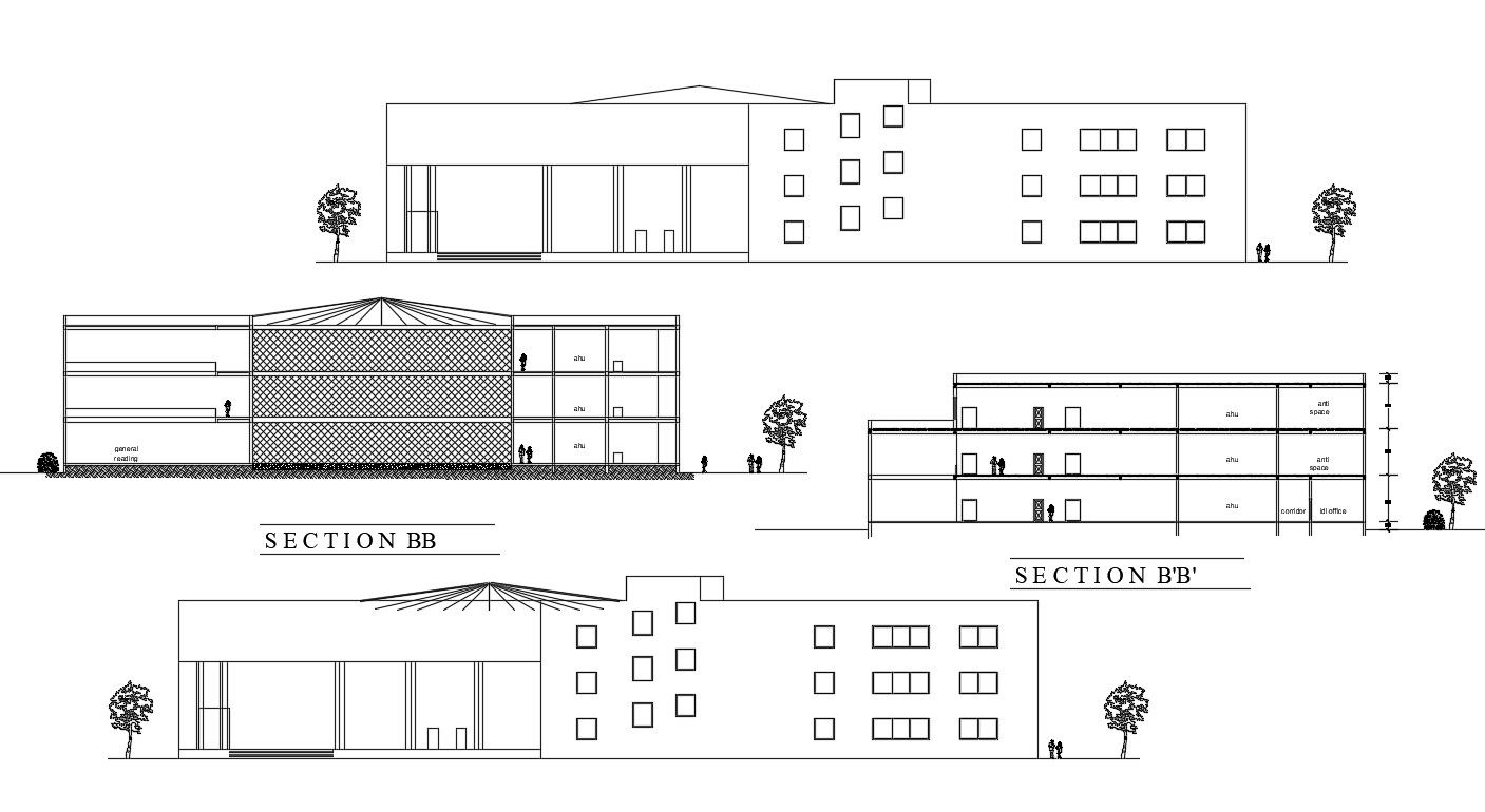 CAD drawing details of building that shows elevation and sectional details and building floor level details leveling details also presented in drawing.