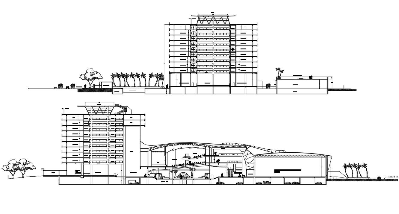 CAD drawing of Building design that shows conventional building elevation and sectional drawing details along with floor level details.