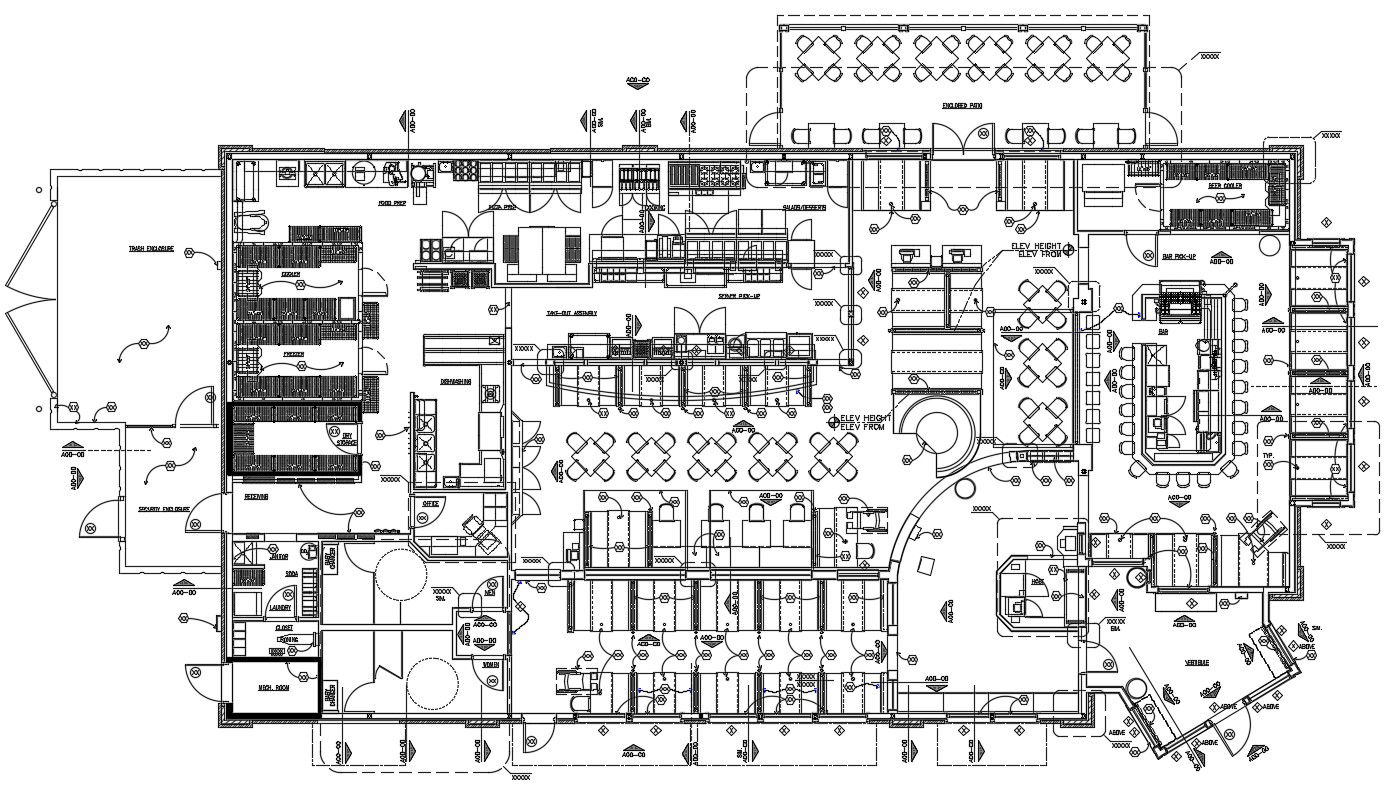 CAD Drawing of Restaurant building floor plan that shows floor plan drawing details of building along with furniture blocks details in building and floor leveling details.