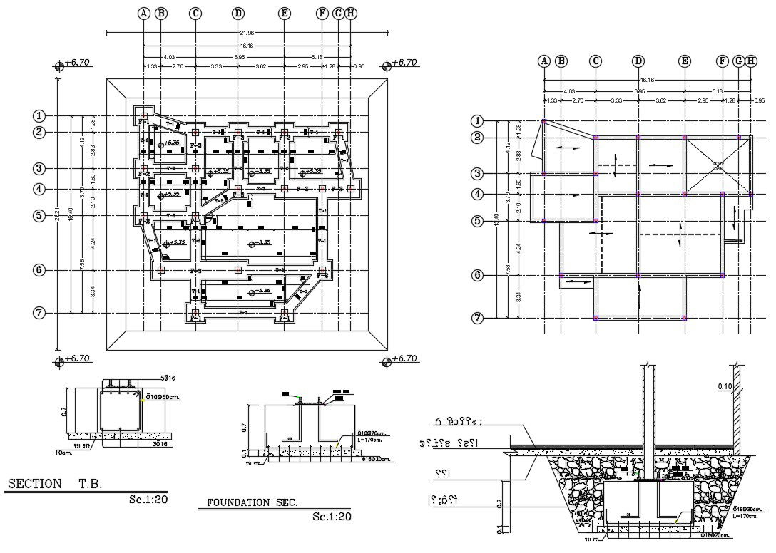 CAD drawing details of RCC foundation structure along with construction details of the footing along with concrete work masonry and reinforcement bars details.