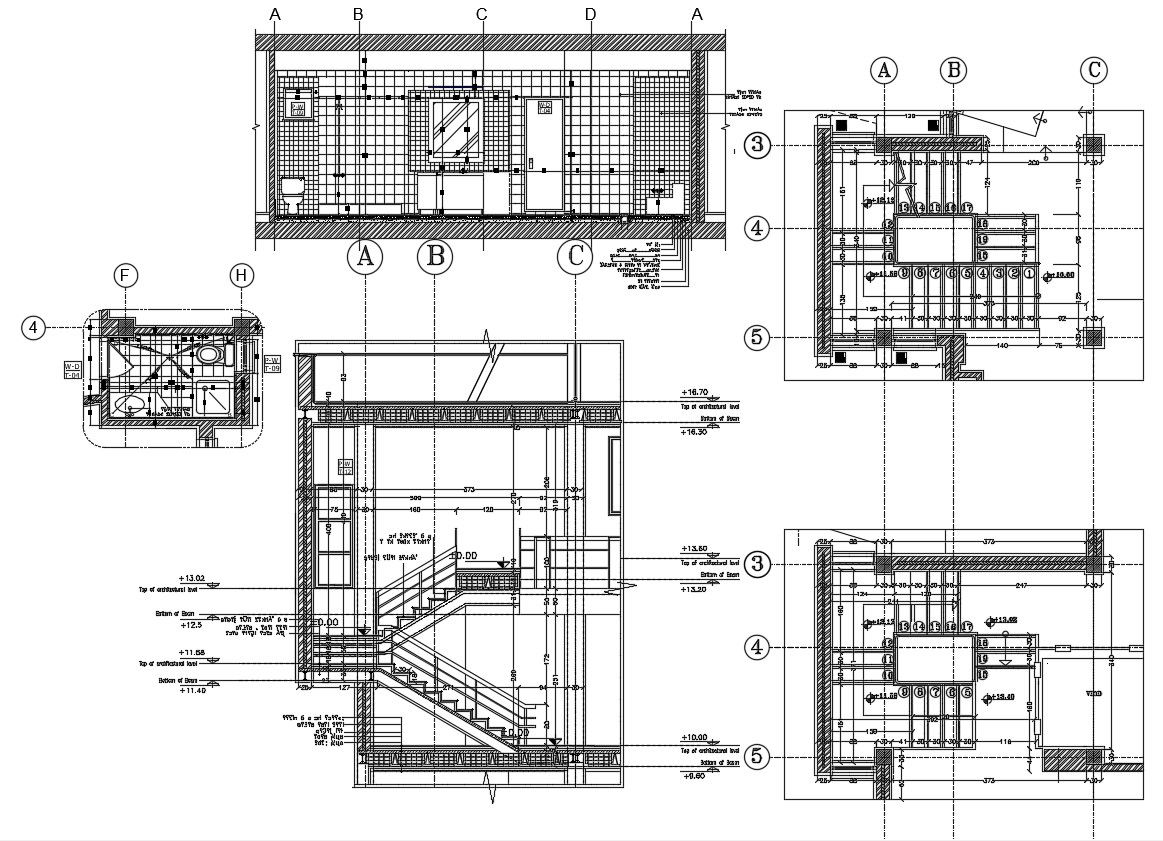 CAD plan and construction drawing of stairway and bathroom details which shows sanitary ware details in the bathroom along with staircase plan and elevation 2d drawing.