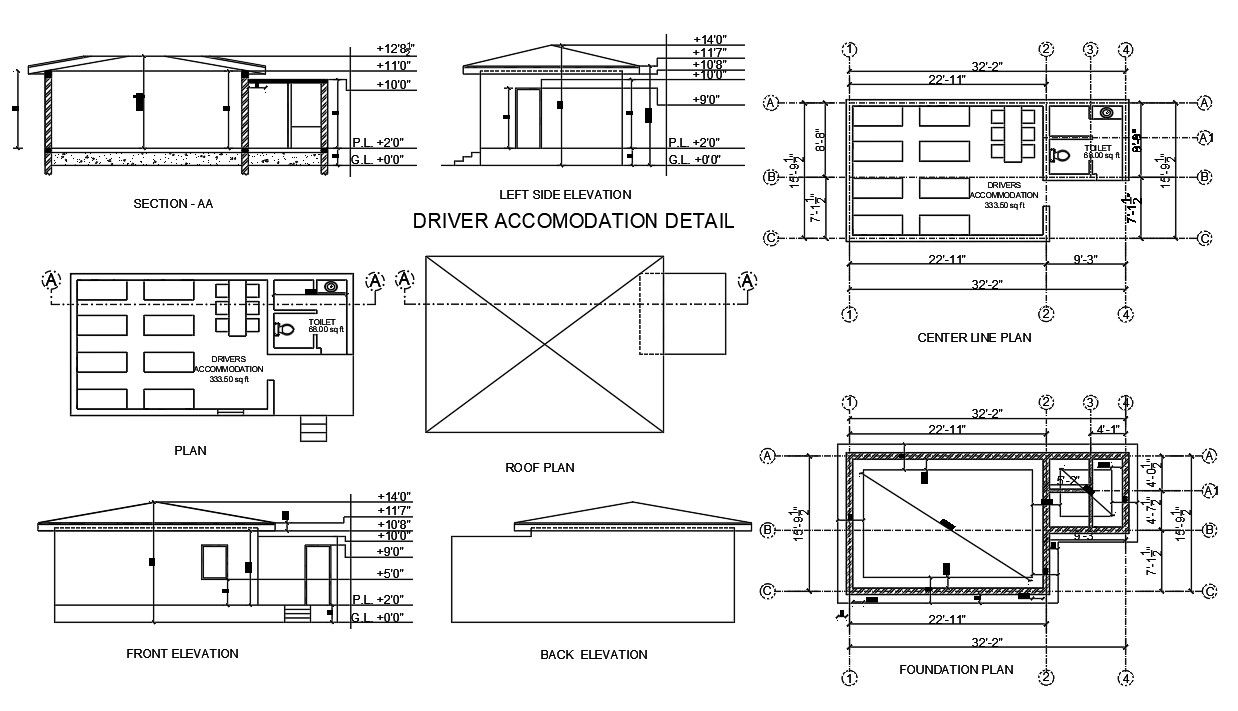 Center Line plan, Foundation lay-out, Left side elvation, roof plan, back elevation, front elevation, & section detail. Driver Accommodation Design.