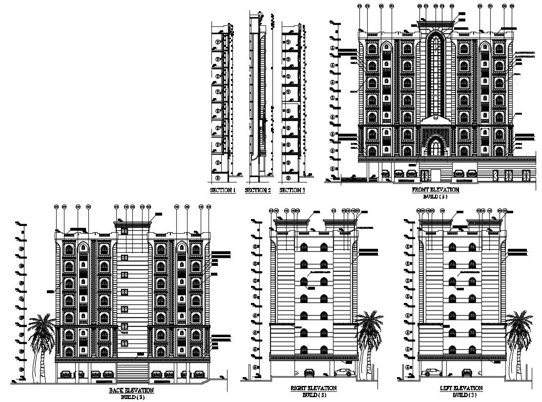 Building elevation plan DWG file; the design shows the front side elevation, back side elevation, right side elevation, left side elevation and also include the car parking area. The dimension details can also be seen.