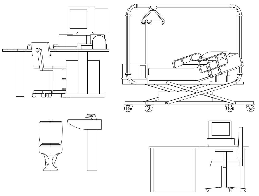 Hospital Furniture Blocks DWG Free Download; 2d CAD drawing shows that computer desk, sanitary ware, and hospital bed.