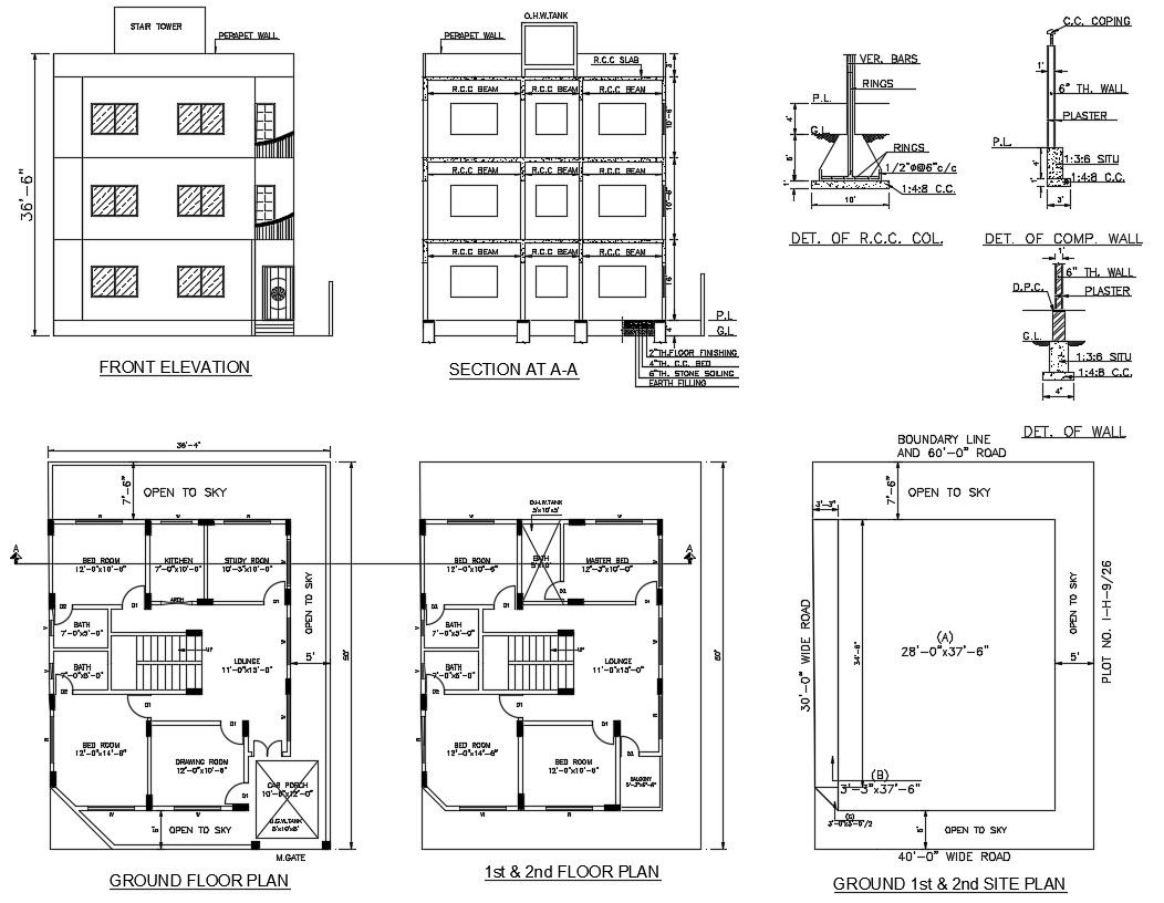 3 storey house cad design; which includes the ground floor plan along with 1 and 2-floor plan. Front elevation and section are also shown with details of RCC column, compound wall, and wall.