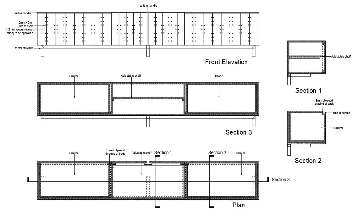 This Furnitur detail in built-in handle, Metal structure, Drawer, Adjustable shelf, 8mm plywood bracing at back, And Front Elevation &