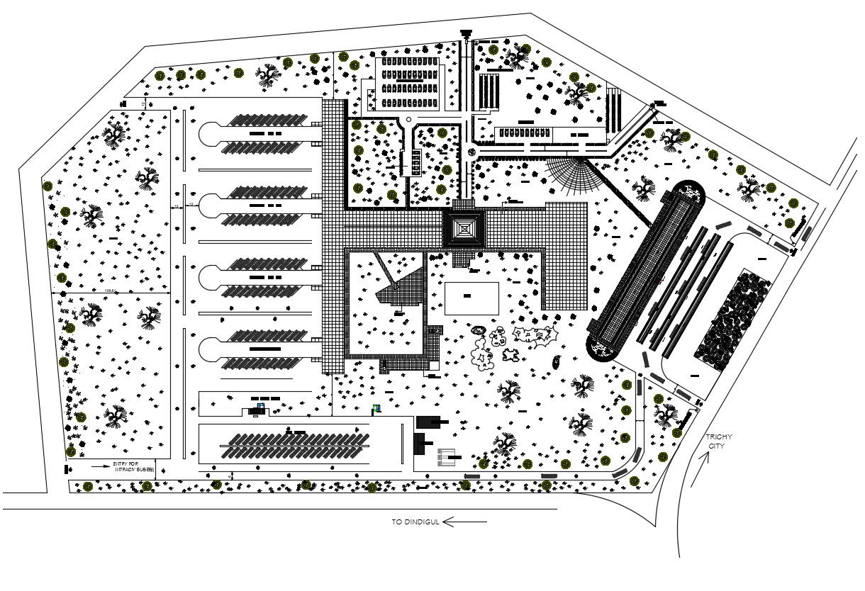 CAD plan of Bus-terminal building that shows a work plan of bus stop building along with markings and signs details along with parking space details.
