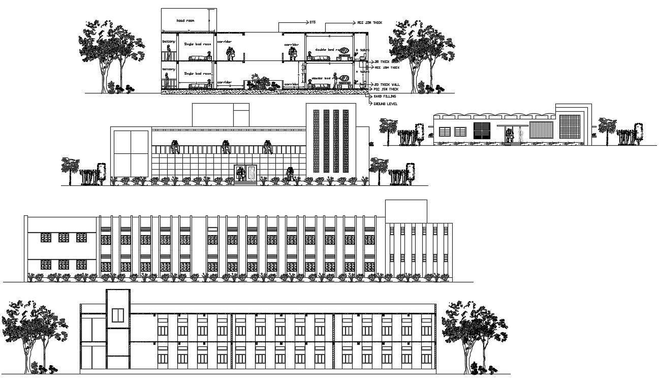 CAD drawing details of the building which shows building sectional drawing details along with building section details and floor level details.