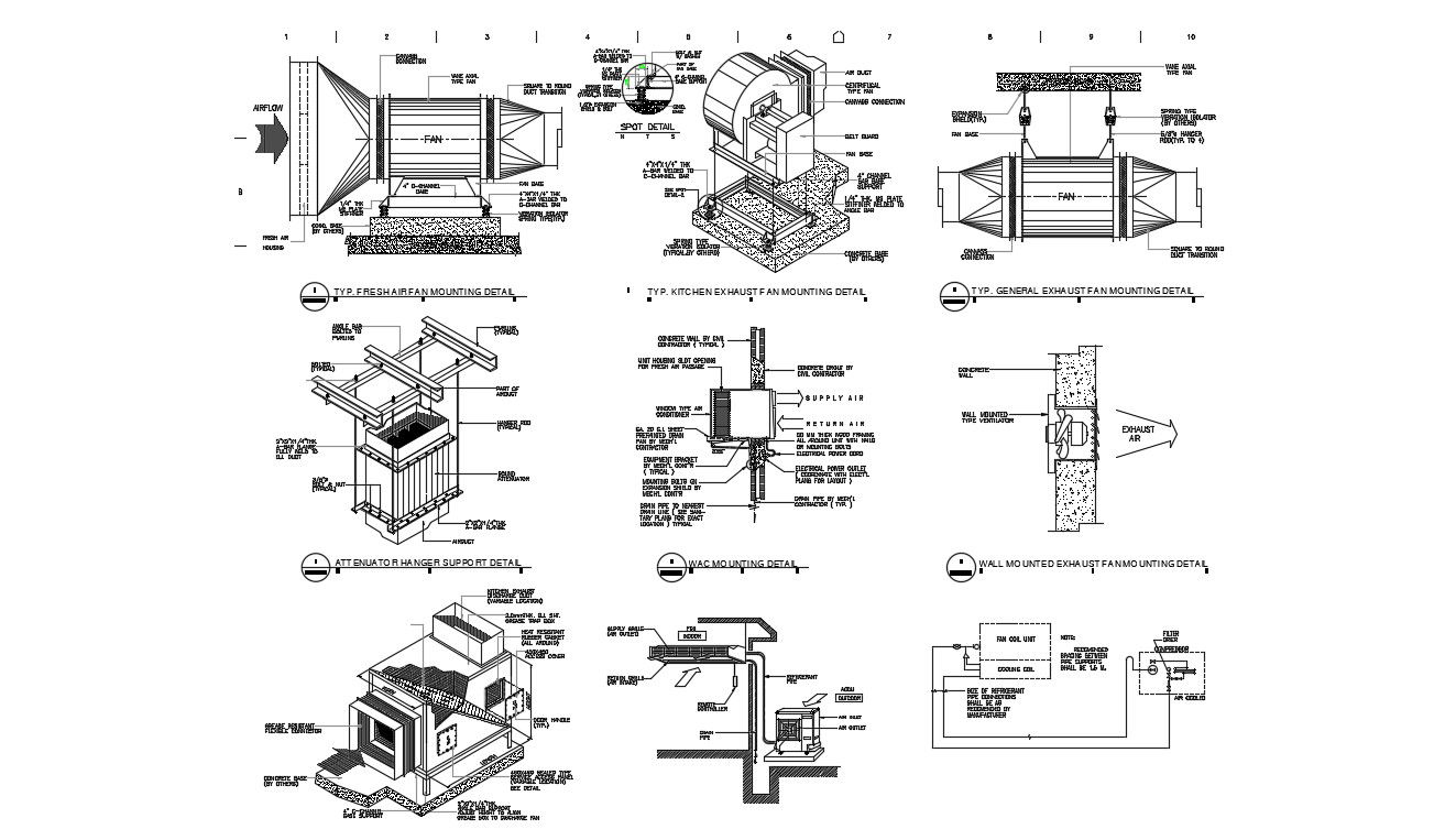 Exhaust fan cad drawing; shows the details of general exhaust fan, kitchen exhaust fan, fresh air fan, united exhaust fan.