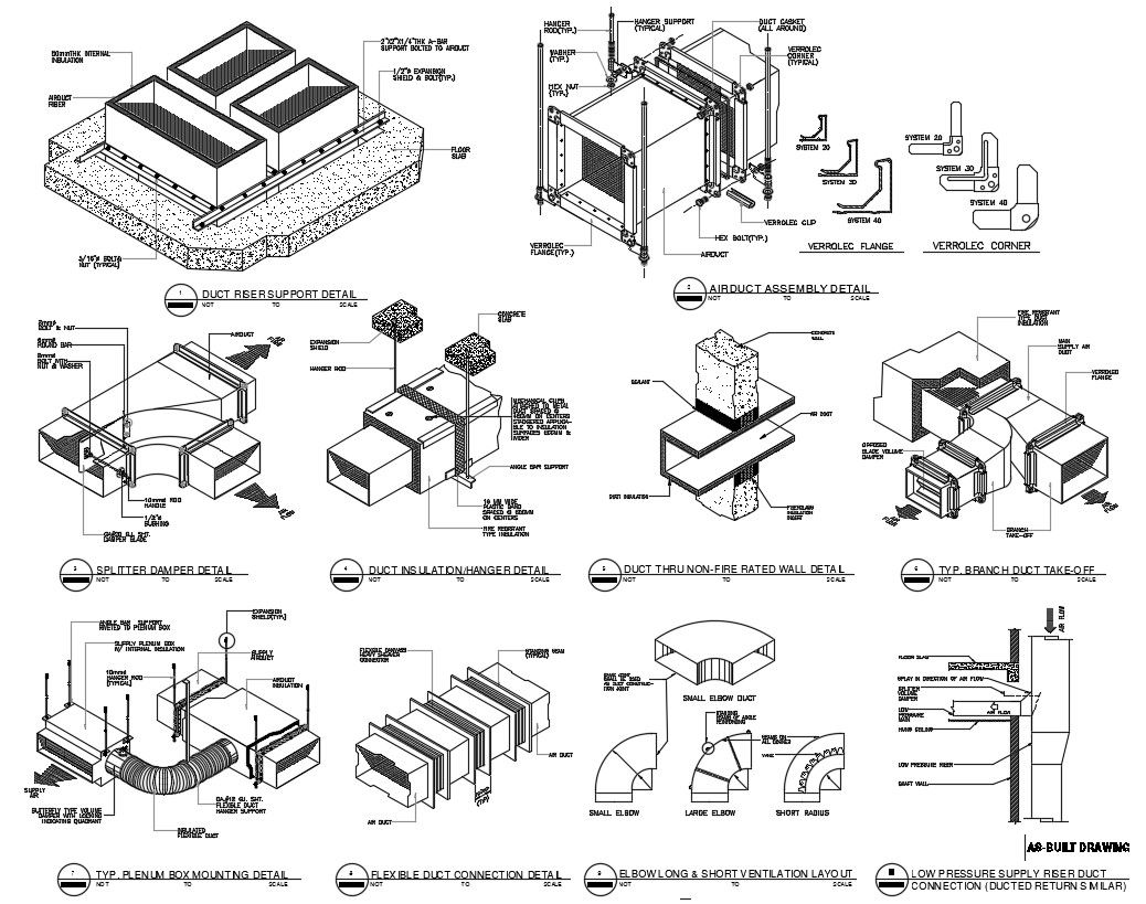 Duct fire cad damper drawing; includes the duct riser support, air duct assembly, variole corner, splitter damper, duct insulation damper, duct thru-non fire-rated, branch duct, and many more.