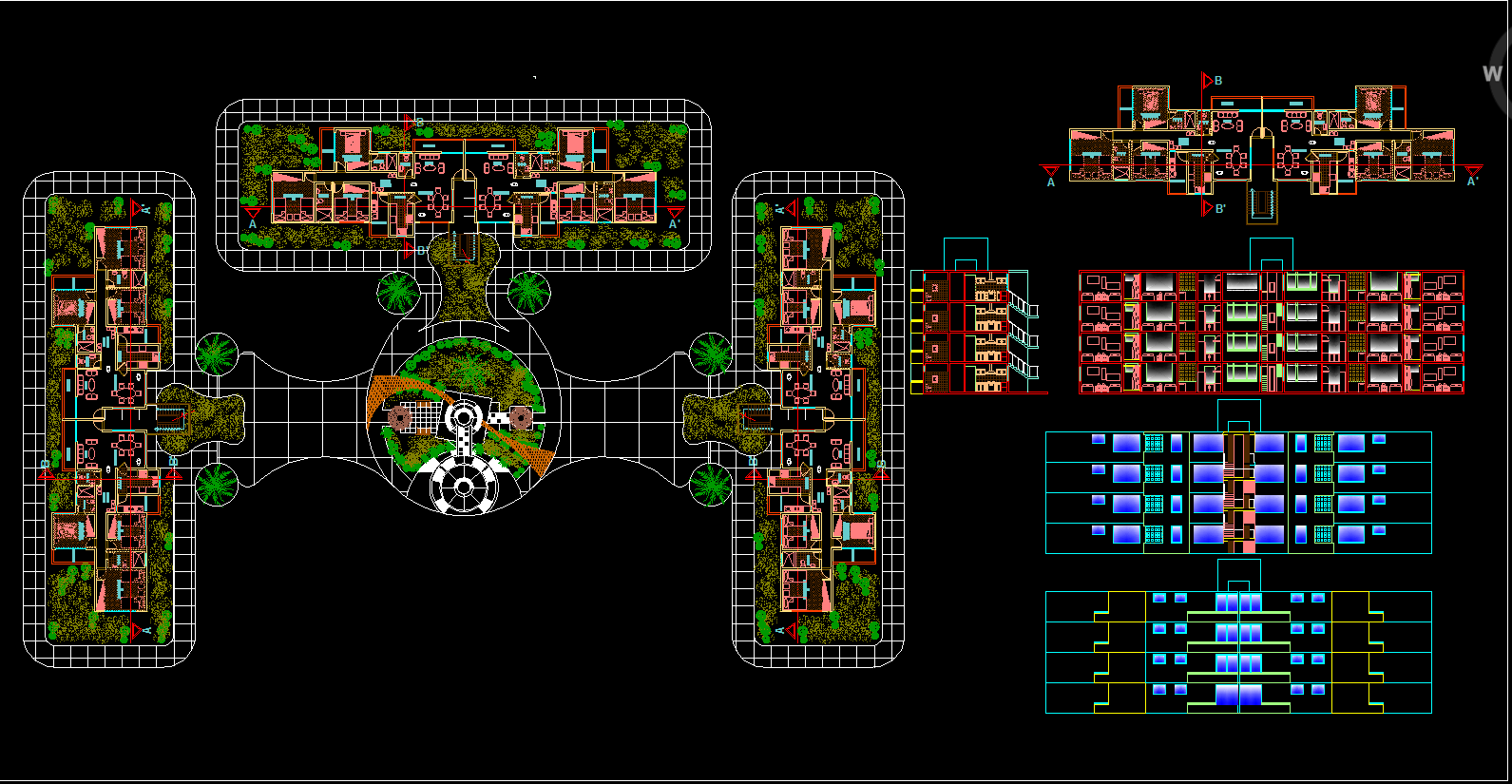 This modern apartment AutoCAD DWG file features a comprehensive set of architectural drawings designed for large-scale residential projects. The file includes detailed floor plans, sectional layouts, and building elevations with structural elements and spatial arrangements. It also contains a master site plan showing green zones, connecting pathways, and parking layouts. Each element is precisely scaled for design accuracy and can be modified or customized in AutoCAD and compatible CAD software.