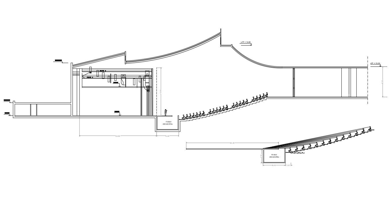 CAD details of auditorium building drawing which shows side elevation design drawing of building along with seating chairs details and auditorium stage details.