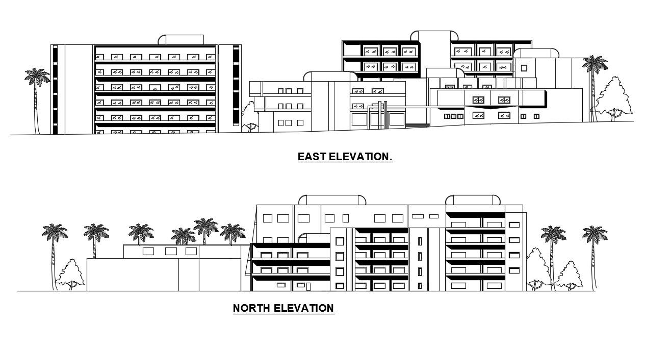 Drawing of commercial building elevation layout design that shows building different sides of elevation like east elevation and north elevation.
