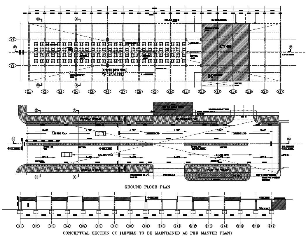 Ground floor house cad plan; shows the kitchen area, dining area. The dimensions details are also shown.