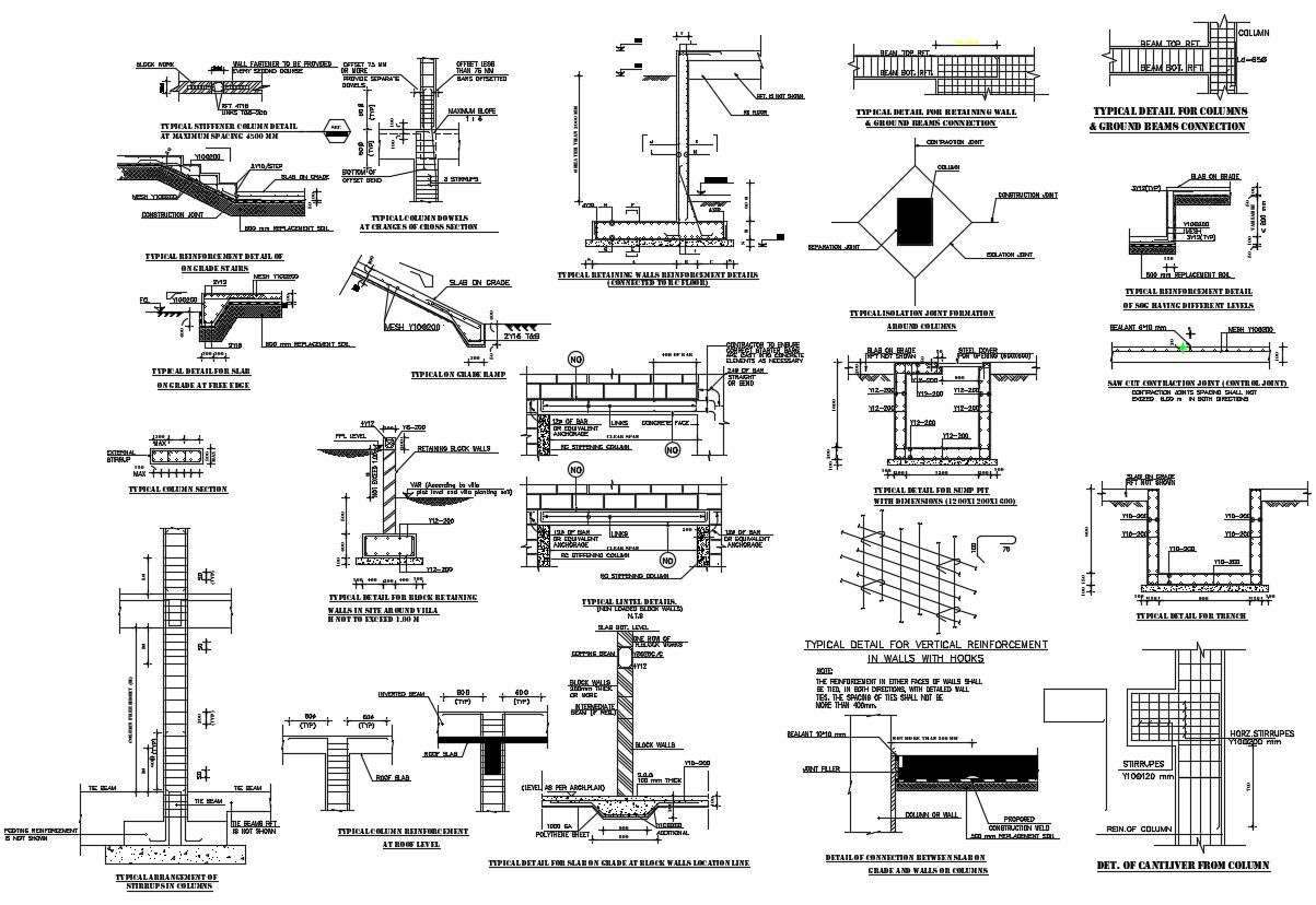 RCC structure design includes construction details of the staircase, column and beam joints, foundation details, brick masonry wall, and other structural block details.