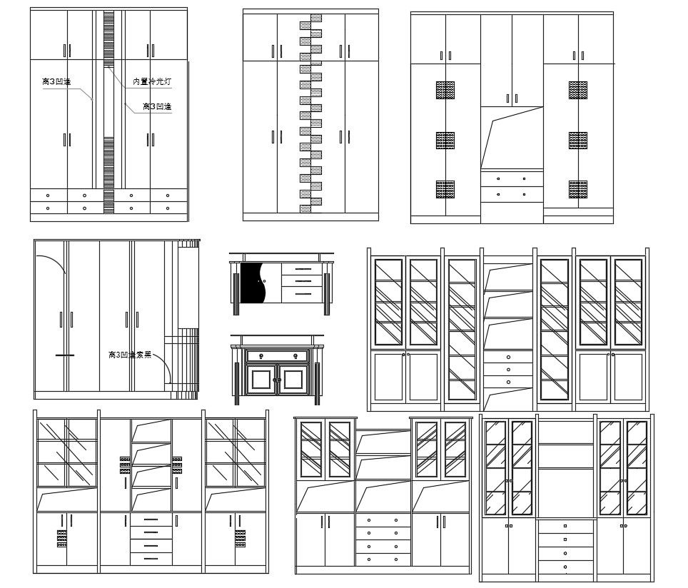 Wardrobe cad block; shows the different cupboard design, along with cabinet and drawers design.