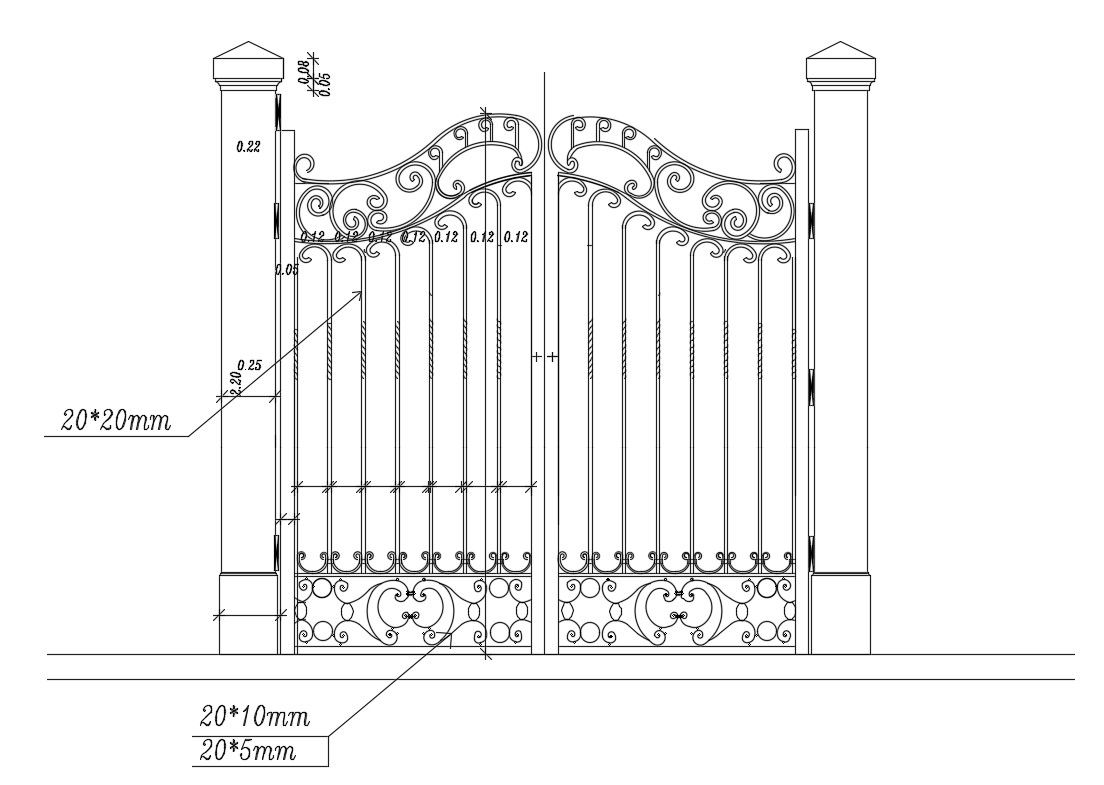 Iron Gate Design DWG File; download DWG file of Iron Gate Design, its shows front elevation design and dimension detail in 2d CAD drawing.