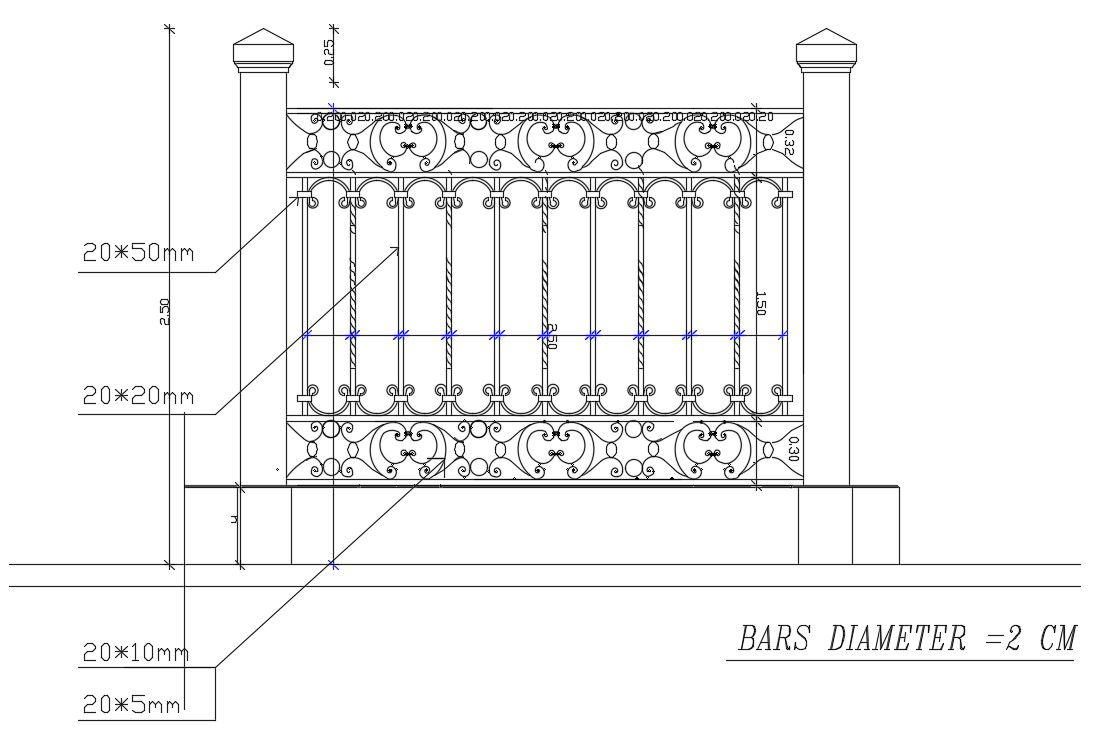 Balcony Railing CAD Blocks; front elevation design of iron railing with dimension detail, download free CAD blocks of railing gate and use CAD presentation.