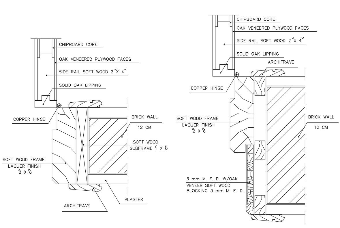 Door Section Detail DWG File; top view of 2d CAD drawing includes door architrave and softwood frame installation on brick wall with description details.