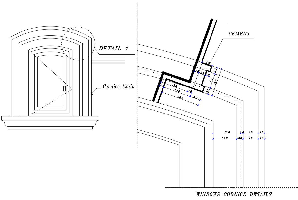 Window Cornice Detail DWG File; 2d CAD drawing of window cornice design with dimension detail, download free AutoCAD file of window cornice detail which is saved in AutoCAD 2016 version.