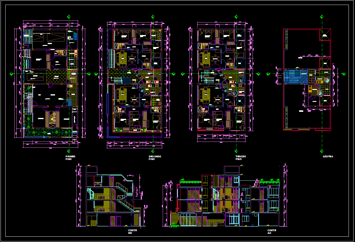 This modern apartment AutoCAD DWG file provides complete architectural layouts for a multi-storey residential building. The drawing set includes floor plans with detailed furniture arrangements, dimensions, and room distributions across all levels. It also contains section drawings that represent the vertical spatial design and structure. The plans feature a clear alignment of spaces such as living areas, bedrooms, staircases, and utility zones, making it ideal for professional architectural design and presentation.
