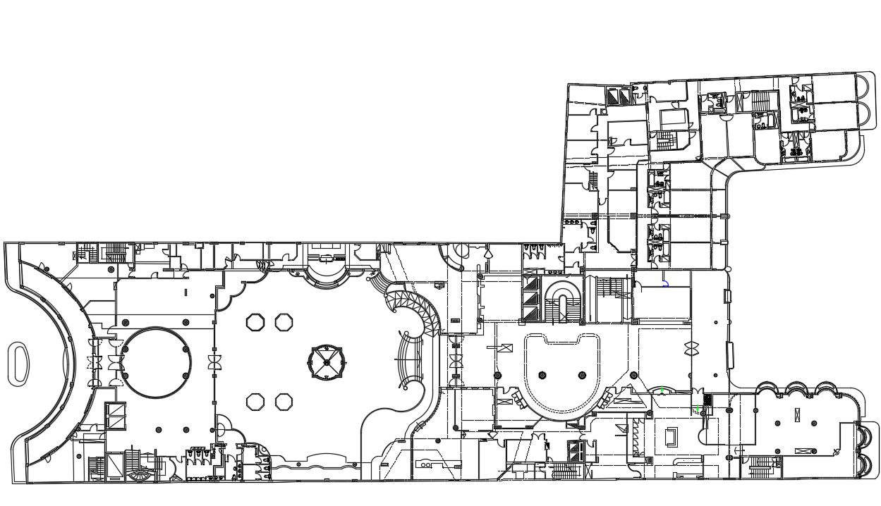 CAD drawing details of commercial building design plan which shows the floor plan of building along with staircase details, door and window details, rooms details and other units details of the building.