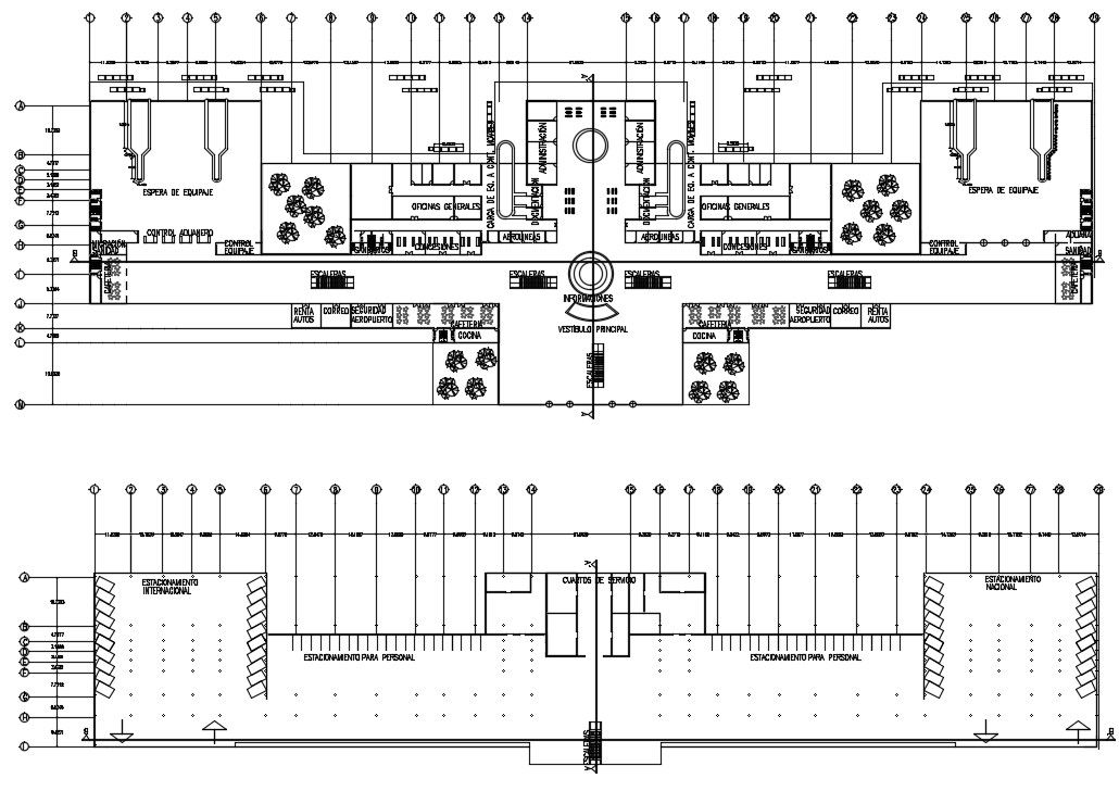 CAD design of airport layout which shows the floor plan design of the airport along with terminal building amenities and facilities details.