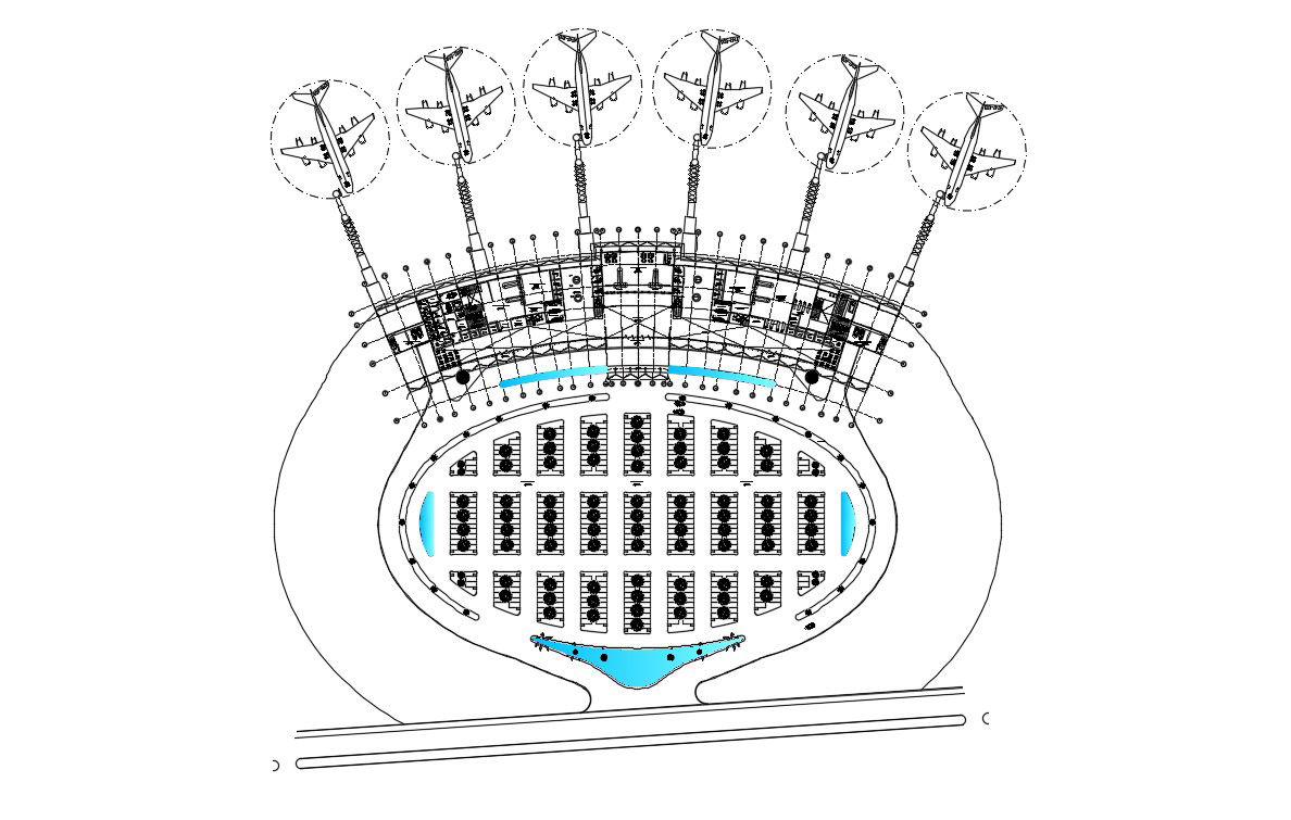 Apron design CAD layout plan of airport which shows the design layout plan of airport parking system along with the terminal building floor plan
