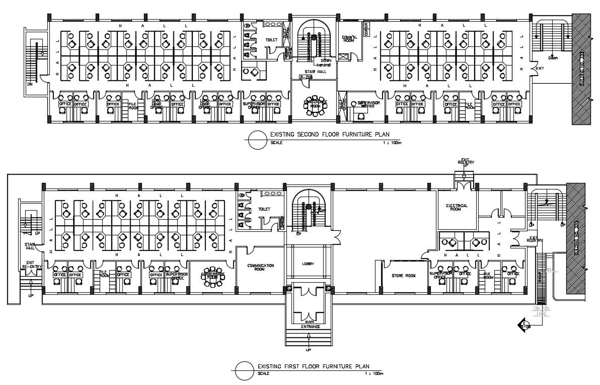 Office design layout plan which shows the work floor plan of building along with furniture layout design in building and floor level section line details also included in the drawing.
