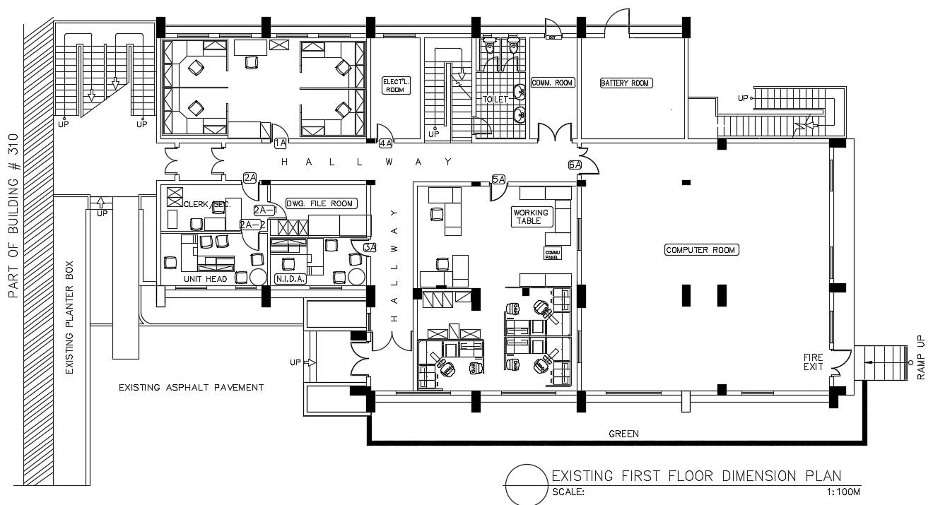 2d CAD plan design of the commercial building which shows the work layout plan of building along with dimension hidden line details. Furniture blocks details.