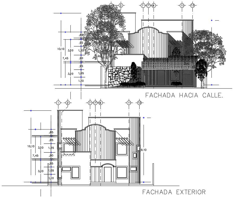 2d drawing of bungalow elevation which shows house different sides of elevation like front elevation and rear elevation along with floor leveling details.