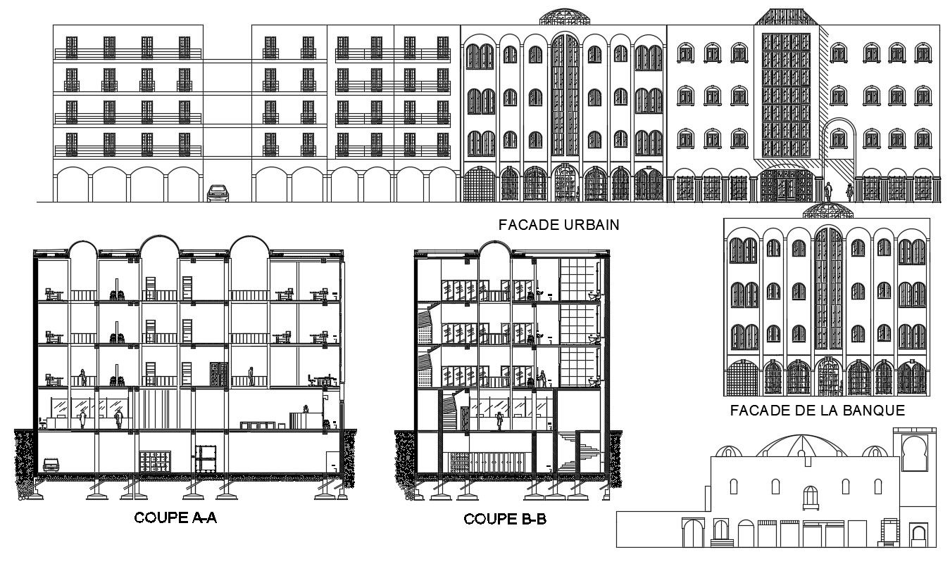 Government bank design elevation and sectional 2d drawing which also shows building different sides of elevation along with floor leveling details.