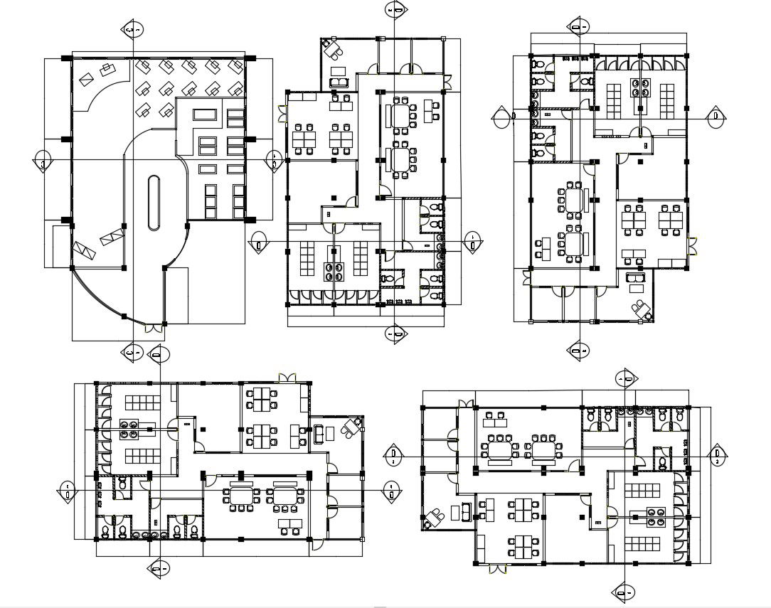 CAD design plan of a commercial building which also shows furniture blocks details in building along with floor plan details and section line details.