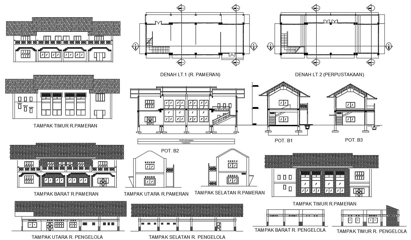 CAD elevation plan and a section of workshop design which includes details of section line, floor level,m roofing structure shade details, building different sides of elevation and sectional details.