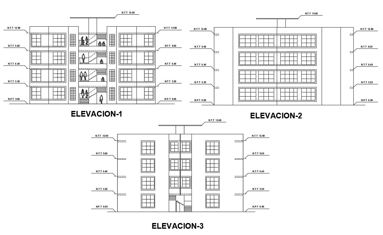 Apartment elevation 2d drawing design which shows housing apartment different sides of elevation like front elevation, side elevation and rear elevation along with floor level details.