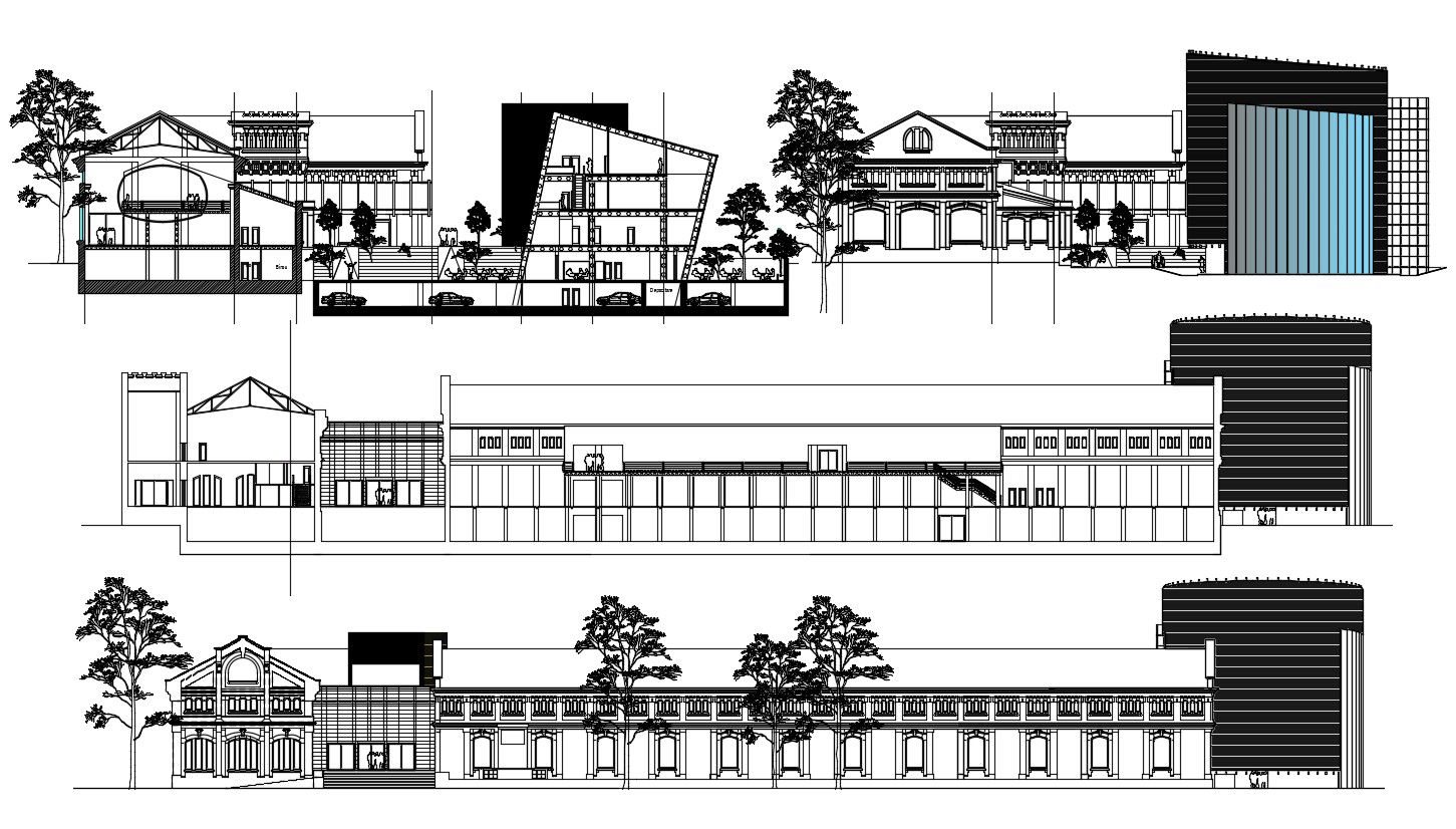 2d elevation and sectional drawing of museum along with floor level details and basement parking space details.