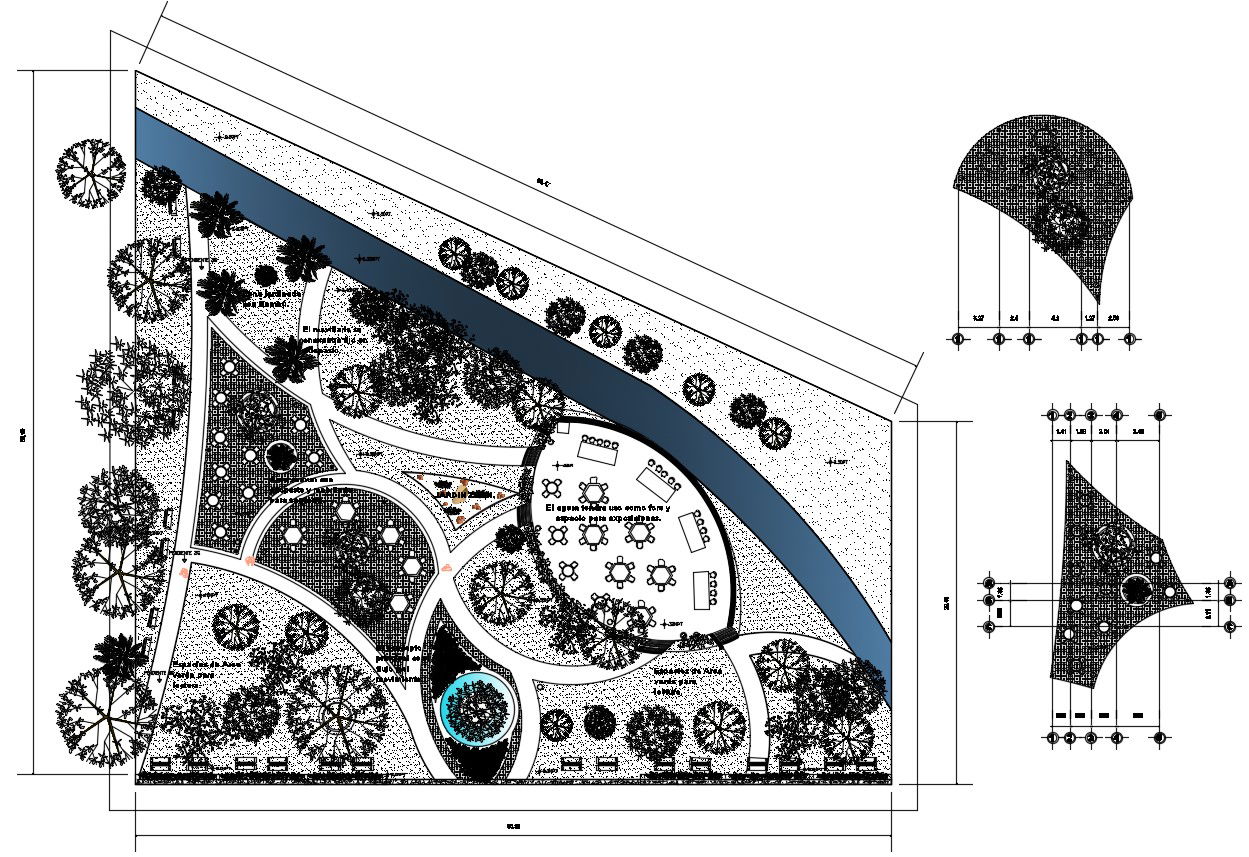 CAD plan of garden restaurant which also includes furniture blocks details in building along with landscaping details, boundary wall details, dining area details, kitchen area details, etc.