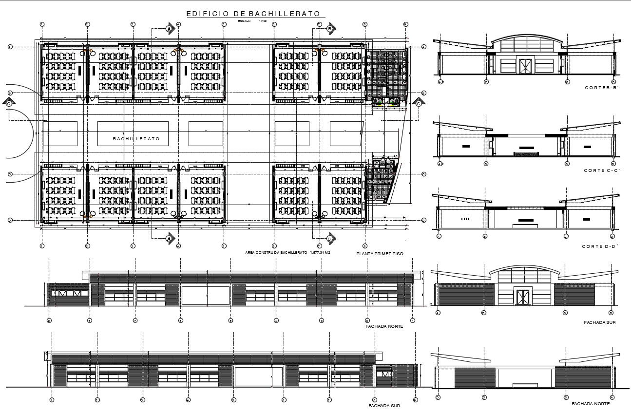 Plan elevation and sectional design of classroom which shows furniture blocks details in building along with dimension section line details.