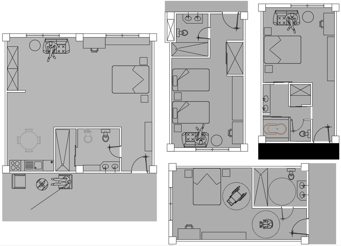 Hotel Bedroom Plan DWG File; 2d CAD drawing of hotel bedroom plan includes different options of bedrooms like room size and furniture details. download DWG hotel bedroom and use this idea for your hotel project CAD presentation.