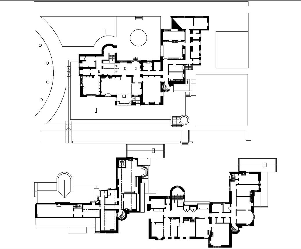Hill House Floor Plan DWG file; 2d CAD drawing of hill house floor layout plan includes ground floor, first floor and second floor plan with wall detailing.