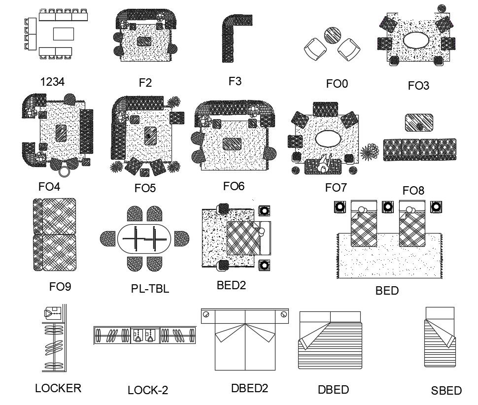 House Furniture Free CAD Blocks DWG file; downloads free AutoCAD file of house furniture CAD blocks like a living room sofa set with carpet, dining table, wardrobe, and beds.