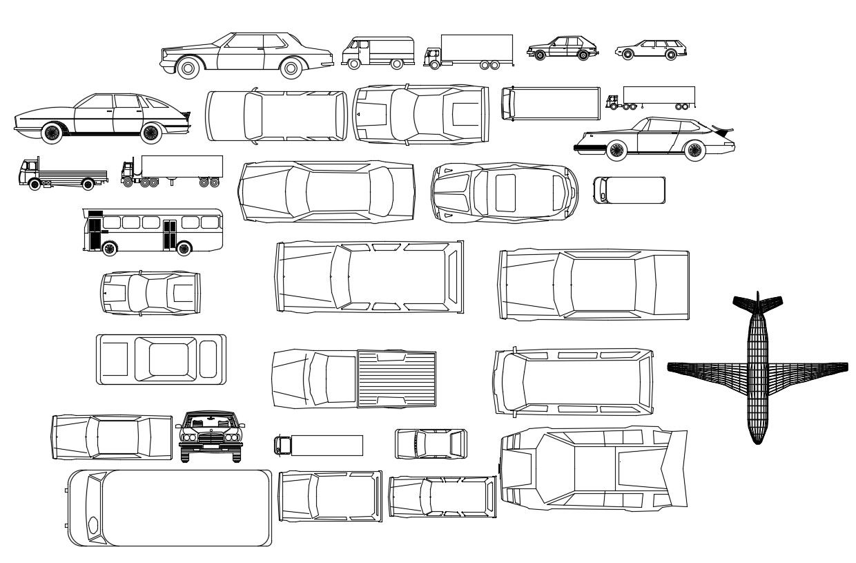 Vehicle CAD Blocks Free Download DWG file; 2d CAD drawing of vehicle CAD blocks top view and side elevation includes car, bus, truck, and plane.
