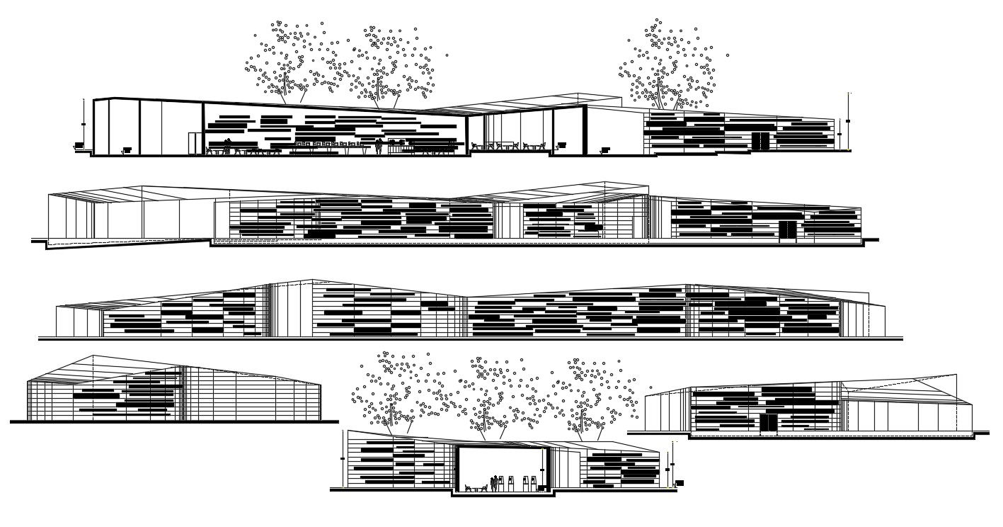 Elevation and section 2d drawing of restaurant which shows furniture blocks details along with floor level details building.