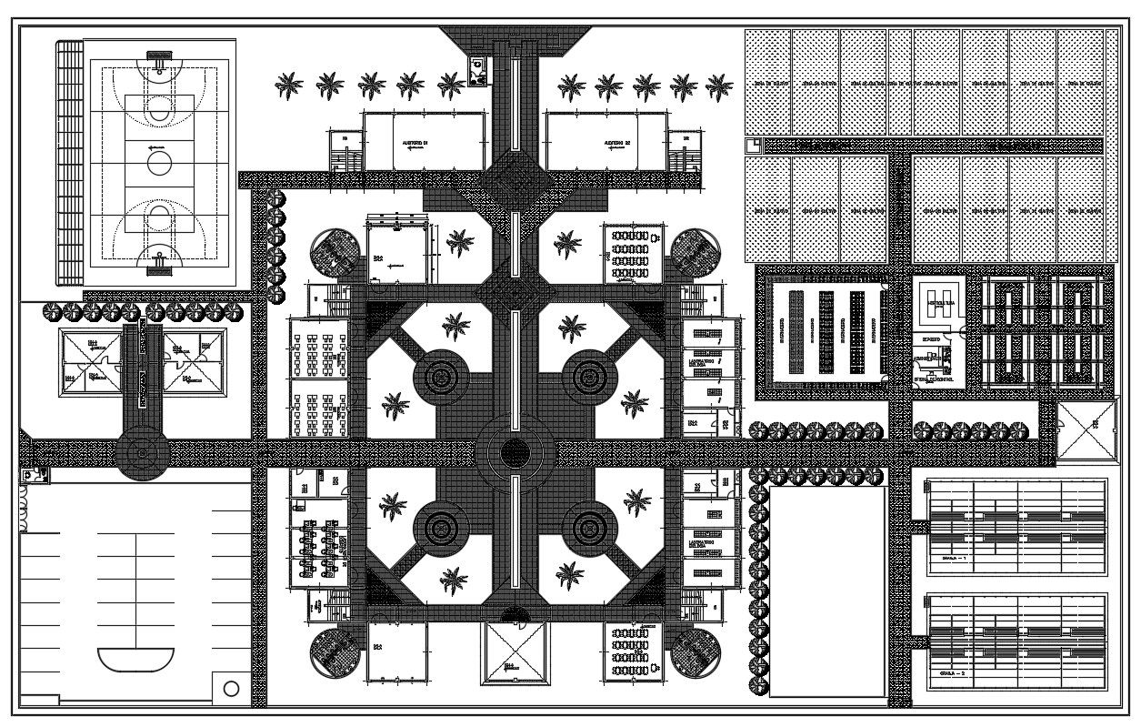 2d design of school area detailing CAD file which shows sport playground details along with parking space details school floor plan details, andcsa[ping details, boundary wall details, etc.