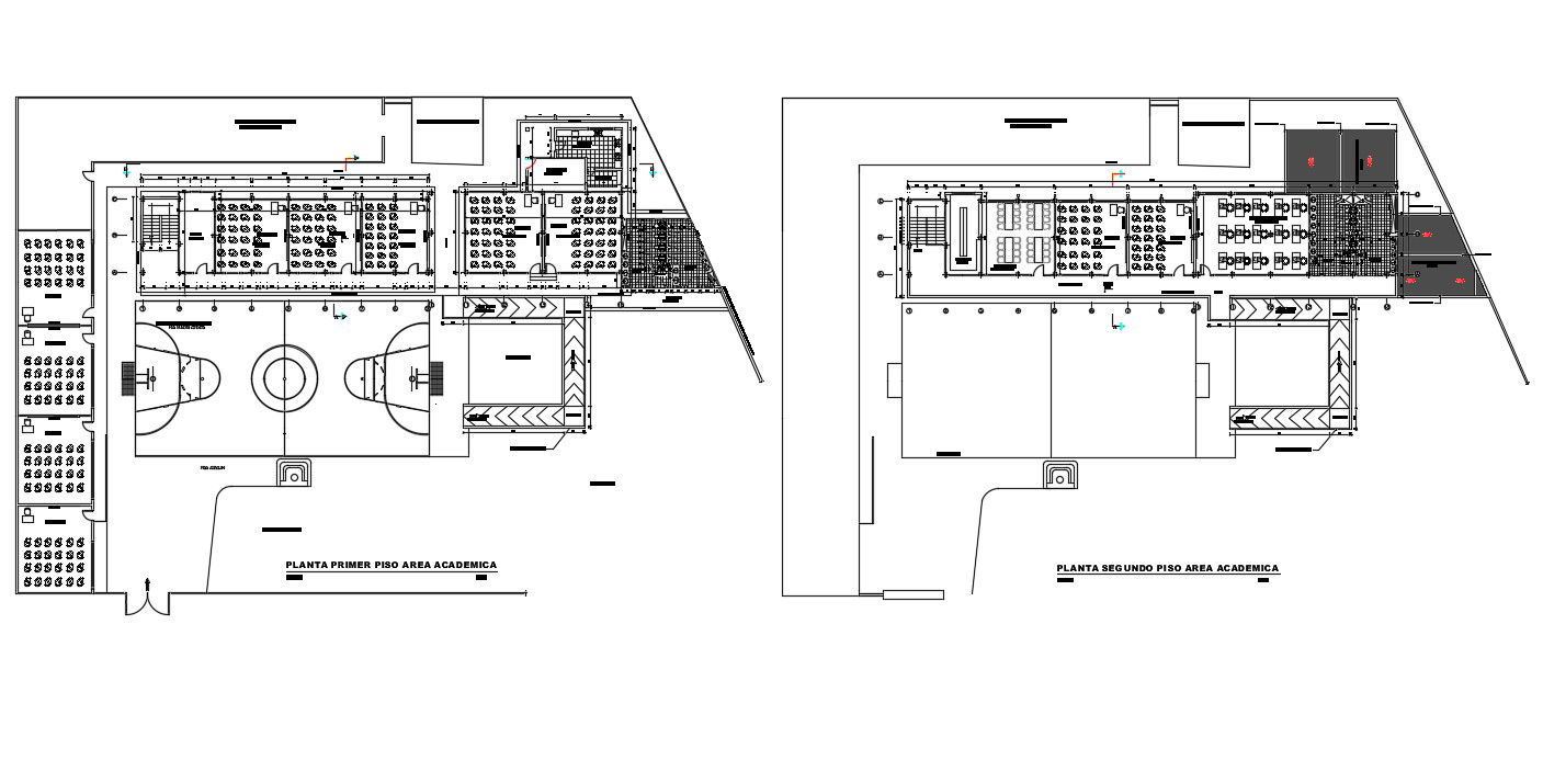 2d Design of college building layout plan which also includes furniture layout details design in building along with parking space details., sports playground details, ground markings and signs detail, furniture blocks details in the building, etc.